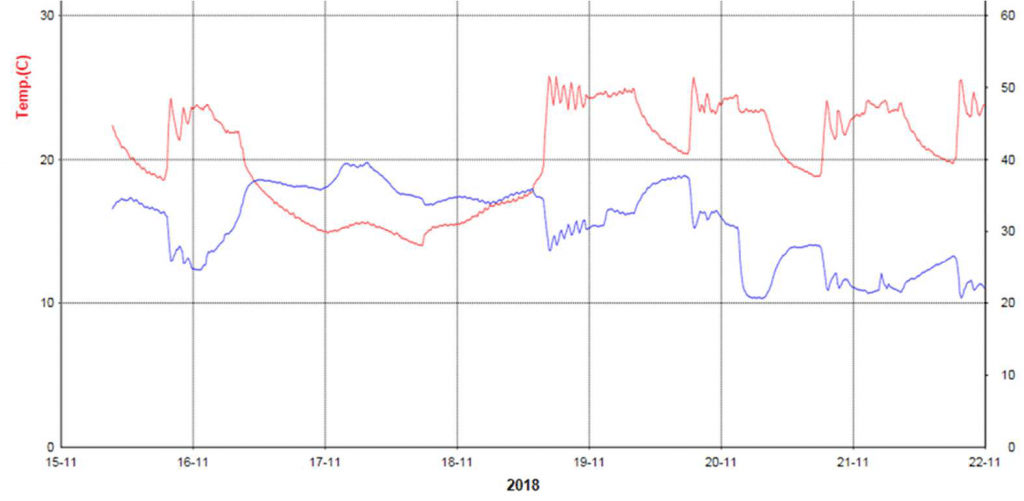 The temperature (red line) was measured from November 15 until 21 as is shown in figure 1. Temperature reached a minimum at 15°C and a maximum at 25°C.