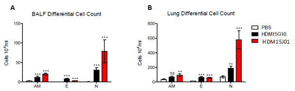Botch batches of Citeq induce a response in alveolar macrophage (AM), eosinophil (E) and neutrophil (N) cells. Batch 15J01 induces a larger response in comparison to batch 15G10.