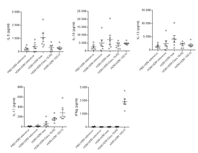 IL-5, 10 & 13 cytokine production is equal in all products. IL-17 and IFN-y production was higher when Mice were treated with Citeq HDM 15G10.
